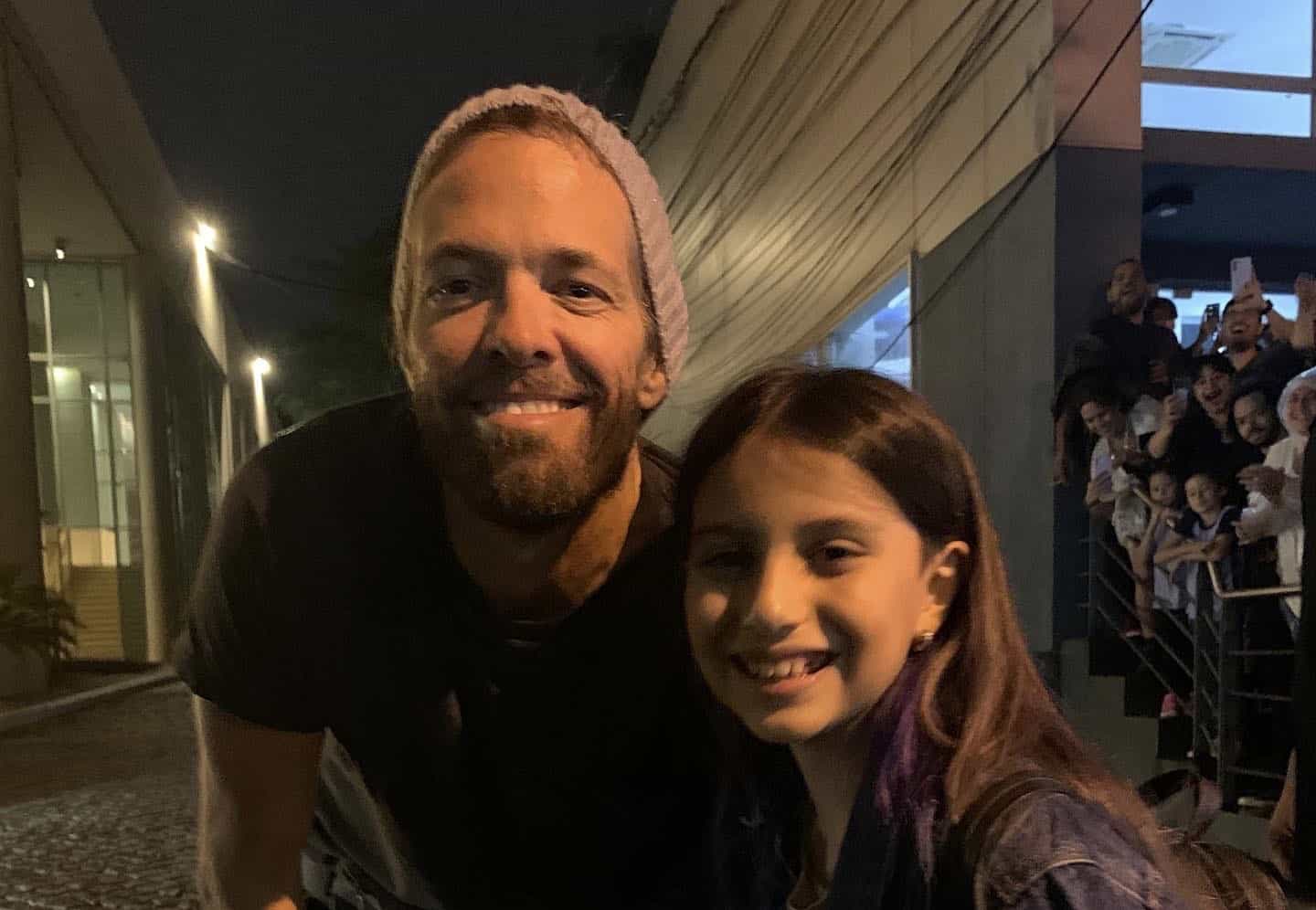 Mi hija desde que se enteró que venían los Foo Fighters empezó una campaña para conocerlos. Hoy llevamos su batería a tocar frente al Sheraton y miren quien salió ante su llamado. 😍 Dreams come true. pic.twitter.com/VpE8dTDY5g