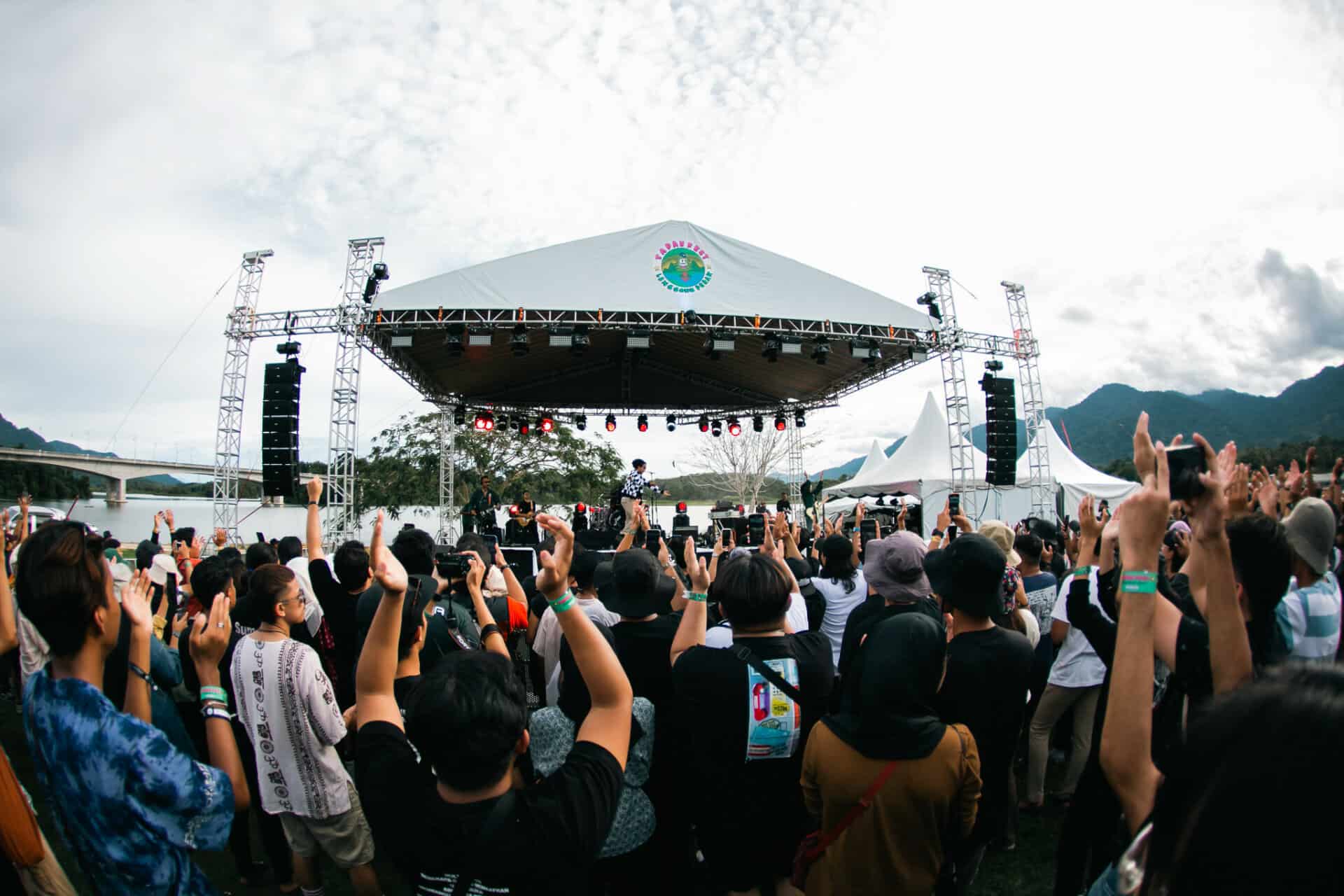 Pentas TAPAUfest 2022 yang luas dengan latar belakang gunung dan tasik.